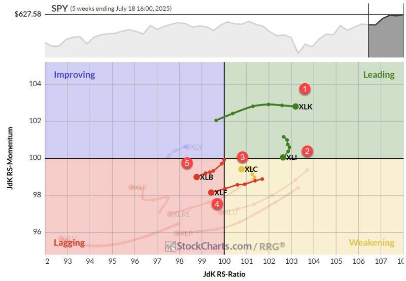 The tech sector continues to flex its muscles, moving up on the price ratio scale while maintaining a stable momentum around 103. This sustained strength is a clear indication that tech remains the sector to beat in the current market environment.